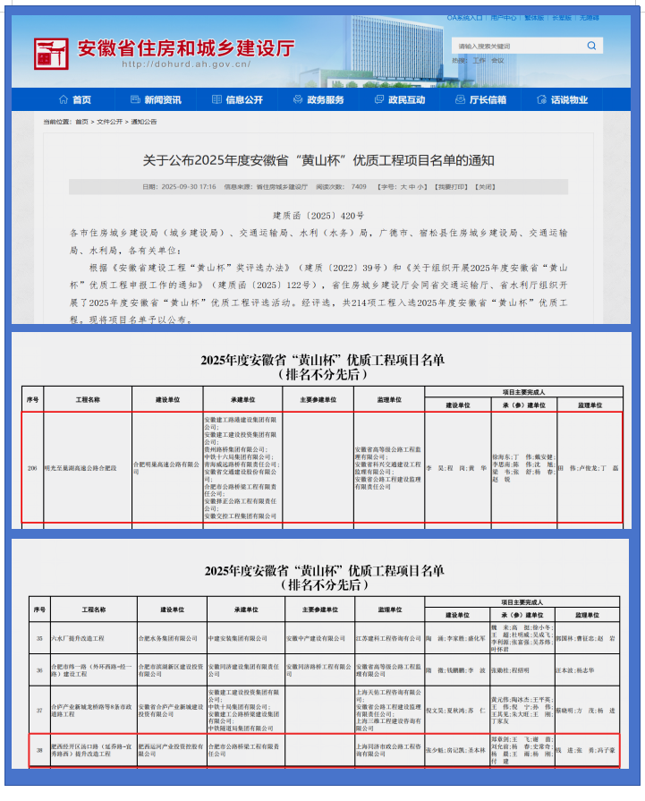 近日,從安徽省住房和城鄉(xiāng)建設(shè)廳獲悉,由省住房城鄉(xiāng)建設(shè)廳會同省交通運輸廳、省水利廳組織開展的2025年度安徽省建設(shè)工程“黃山杯”獎評選活動中,由合肥路橋承建的肥西經(jīng)開區(qū)湯口路(延喬路-宜秀路西)提升改造工程、參建的明光至巢湖高速公路合肥段雙雙榮獲2025年度安徽省建設(shè)工程“黃山杯”獎。